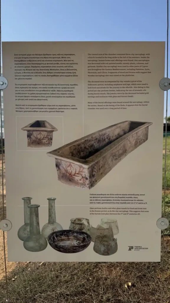 Μια από τις σαρκοφάγους «ήταν διακοσμημένη με κόκκινου χρώματος φυτά, ίσως και γιρλάντες. Παρόμοιες πήλινες σαρκοφάγοι χρησιμοποιούνται και σε άλλες περιοχές της Κύπρου, κυρίως σε θέσεις στα βόρεια και ανατολικά παράλια του νησιού και της Ανατολικής Μεσογείου, όπως στην Παλαιστίνη, τη Συρία, τη Φοινίκη και την Κιλικία».