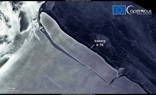 Το παγόβουνο Α-76 κόπηκε από τη δυτική πλευρά της τράπεζας πάγου Ρον στην Ανταρκτική και σήμερα πλέει στη Θάλασσα Γουέντελ, ανακοίνωσε ο Ευρωπαϊκός Οργανισμός Διαστήματος (ESA).