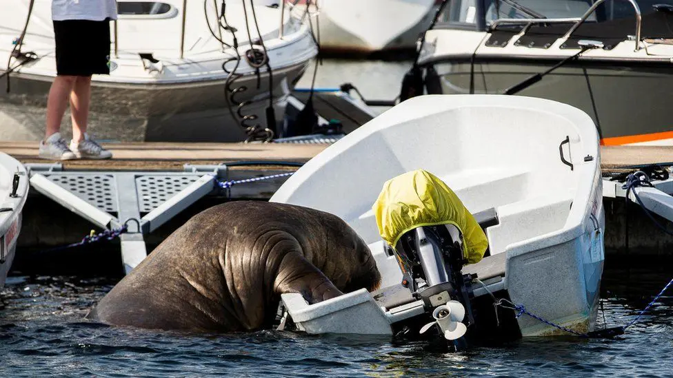 Ο θηλυκός θαλάσσιος ίππος εμφανίστηκε πριν λίγες εβδομάδες, βουτούσε στη θάλασσα, έκανε ηλιοθεραπεία πάνω σε βάρκες, κάποιες από τις οποίες κατέστρεφε.