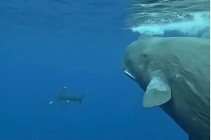 Καθώς ο καρχαρίας συνέχιζε να πλησιάζει, μία από τις φάλαινες του δάγκωσε…